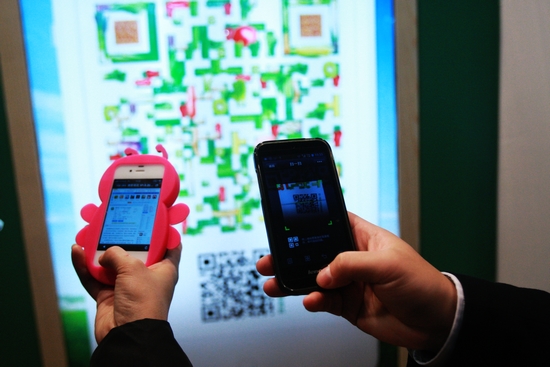 在展会现场,博野有机app系统一揭开面纱,参展市民纷纷拿起手机,通过二维码扫描下载体验博野有机app系统。记者 王立三 摄.