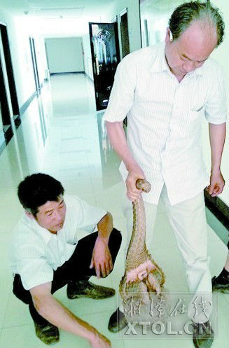 市林业局森保站负责人潘克勤告诉我们,穿山甲的重量一般在3公斤左右,这只9.6公斤重的穿山甲是湘潭市有记载的最大的穿山甲。潘克勤猜测,这只穿山甲很可能是在觅食时受到惊吓,蜷缩成球状后滚落到山塘中。穿山甲的鳞片有极高的药用价值,因此常被大肆捕杀,黑市上的价格卖到每公斤1200元。