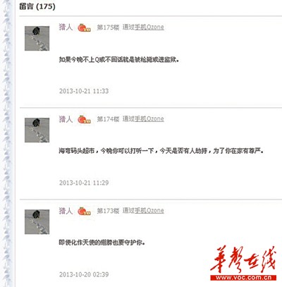 ▲持刀男子周勇在张诗懿QQ空间的留言。(截图)