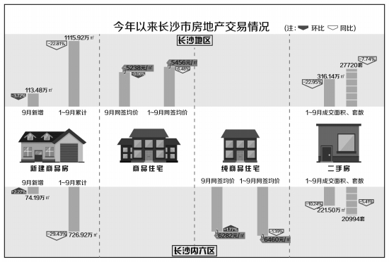 10月9日,长沙市房产研究中心发布权威数据显示,国庆期间(2014.10.1-10.7)长沙内六区新建商品房网签988套,91678平米,成交均价6504元/平米;其中住宅网签723套,76629平米,成交均价6003元/平米。而上周(2014.09.28-2014.10.04)统计数据显示,长沙内六区新建商品房网签1689套,其中住宅网签1441套,住宅网签均价为5908元/平方米。
