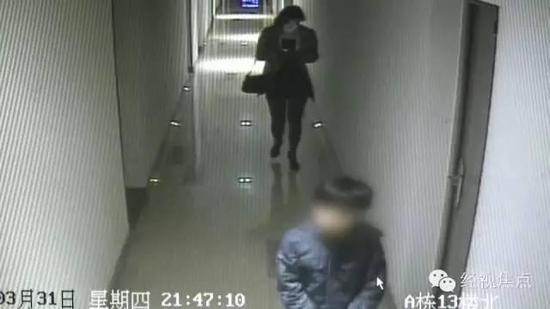 3月31日晚上9点50分左右,邓女士带着8岁的儿子回到家中。可是到了门口,邓女士却突然停了下来。就在这时,电梯里突然走出一名提着行李的中年男子,孩子赶紧帮忙拿东西,跟着他一起进屋了。而在当晚10点42分时,邓女士却突然穿着睡衣,一个人从屋内跑了出来。10点49分的时候,她又走进了屋子里。