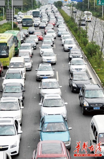 2012年9月30日上午,中秋节,长沙市出城高速遭遇大堵车。车辆缓行形成了20多公里长的“停车场”。距长沙市长常高速岳麓收费站7公里处,出城汽车排起了长龙。记者 李丹 摄