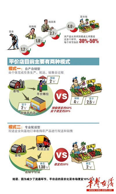 “农产品直销菜店的菜价之所以便宜,主要原因是节省了中间流通环节。”夏礼明说,目前长沙农产品直销(配送)工程主要有两种模式,一是蔬菜基地老板自己开店,自产自销;还有一种是企业向基地订单收购农产品再销售。