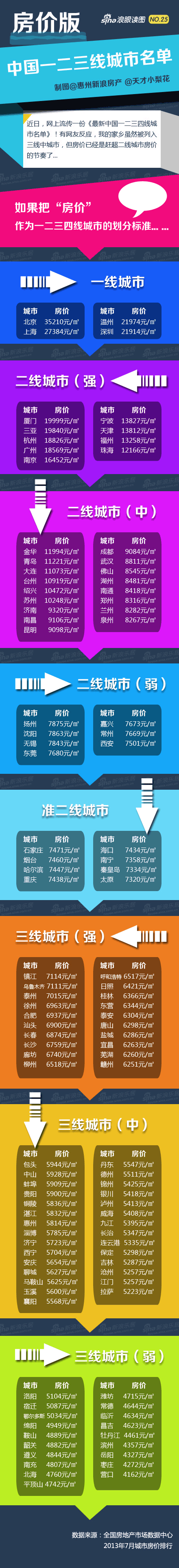 近日网上流传《最新中国一二三四线城市名单》长沙入列二线中,网友根据全国房地产市场数据中心2013年7月城市房价排行制作出《房价版中国一二三四线城市名单》,长沙房价均价6759元/㎡排名三线强,位居第六梯队。
