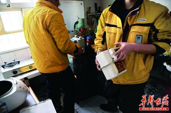1月21日上午,长沙市三湘水暖市场,燃气抢修人员正在给一住户家更换损坏的气表。记者 田超 摄