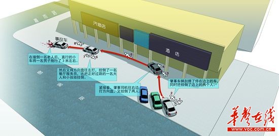“紧接着,司机赶紧往右边打方向盘,往一边的空地行驶,谁知又挂倒了两人。”何女士说,“他见挂倒人后,急着又将方向盘往左打,这下挂倒了一家餐厅的服务员,还把正好过路的一名大人和小孩给挂翻了。”
