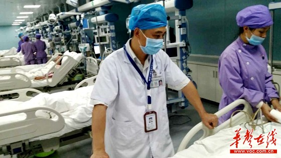 医疗队抵达监利县人民医院后,立即开展救治工作。图为骨科副教授陶澄正在查看伤员。