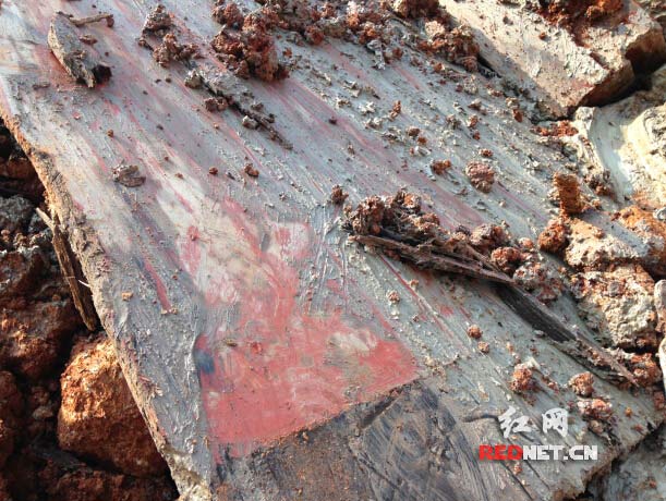 目前现场已被保护起来,旁边堆满挖出来的土层和大块椁木,椁木上仍可见到红色涂料。附近一居民从土中捡起一尖锐木块,形似木剑。