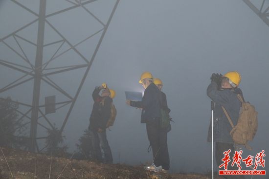 6点55分,终于抵达1883号杆塔下,此时,山中的浓雾还没有化开,来不及喘口气,大家十分默契的开始了手中的工作。用望远镜观测放电火花、用红外测温仪进行检测、用风速测量仪测风速……