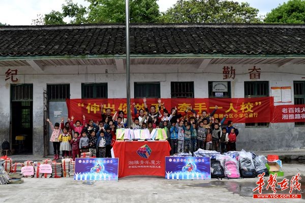 街道工委书记蒋君介绍说,“伸出你的手,牵手一人校”关爱湘西贫困学生公益行是湘雅路“手牵手,一起走”书记项目的升级版,目标是在原有的共建基础上,充分发挥党建引领作用,融合群团、统战力量,实现“党建+”的功效,与湘雅路的老百姓大药房组建湘雅青年魔方团建项目,促进该项目品牌的提升。与大山深处"一人校"的牵手,感动的是青春无悔的坚守,收获的是奉献社会的励志,在孩子们期待的目光里,将会积聚更多的关注关爱。