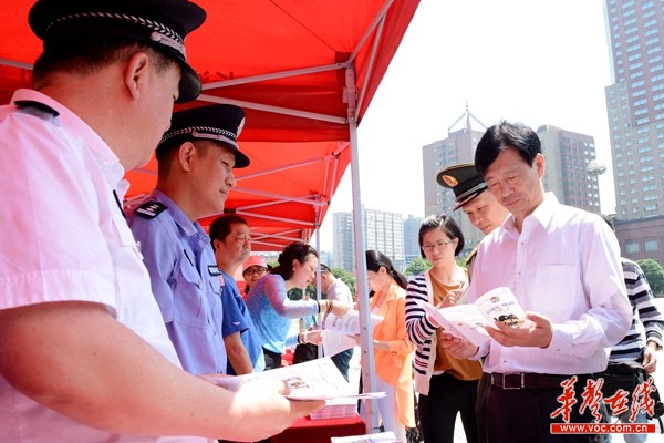 在湖南省公安厅应急宣传点前,湖南省副省长蔡振红仔细阅读宣传资料。记者 龙腾 摄