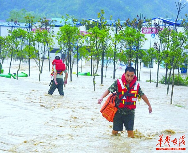 ▲7月18日,张家界市永定区沙堤乡,消防官兵趟水进行搜救。当天,该市消防支队的官兵全体出警展开救援行动。