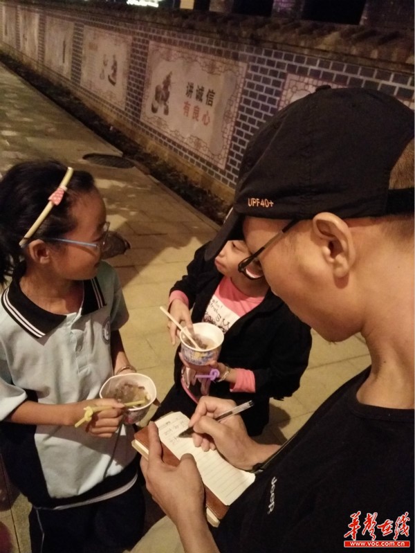 27日晚,唐国明一行人来到城步民族体育馆观看夜景,一个叫刘曼妮的小朋友前来询问“叔叔阿姨们好!请问这位戴黑鸭舌帽、穿圆领T恤、背黄挎包的叔叔是考古复原红楼梦曹文后20回的唐国明老师吗?”