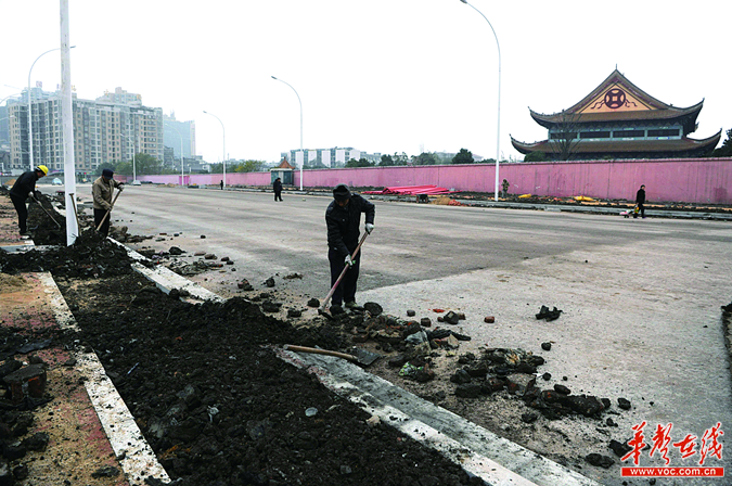近日,在与开福寺达成最终协商后,围墙撤出路基范围,来自长沙市市政工程有限公司的工人们再度进场,对剩余300米段进行施工。