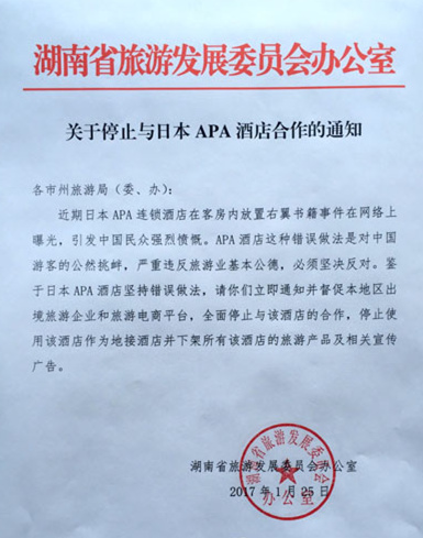 近期日本APA连锁酒店在客房内放置右翼书籍事件在网络上曝光,引发中国民众的强烈愤慨。APA酒店这种错误做法是对中国游客的公然挑衅,严重违反旅游业基本公德,必须坚决反对。鉴于日本APA酒店坚持错误做法,请你们立即通知并督促本地区出境旅游企业和旅游电商平台,全面停止与该酒店的合作,停止使用该酒店作为地接酒店并下架所有该酒店的旅游产品及相关宣传广告。