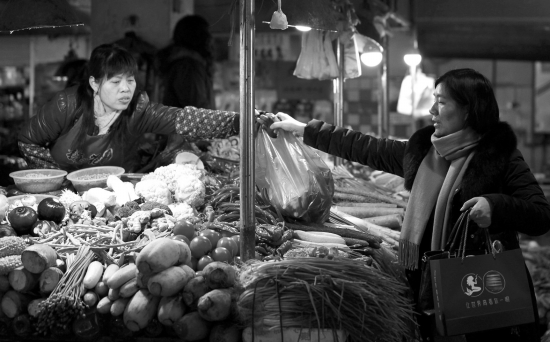1月15日,长沙市铁道生鲜市场,市民在王女士的摊位上购买蔬菜。王女士来自临湘,在这里已经卖了七八年的 菜。图/记者金林