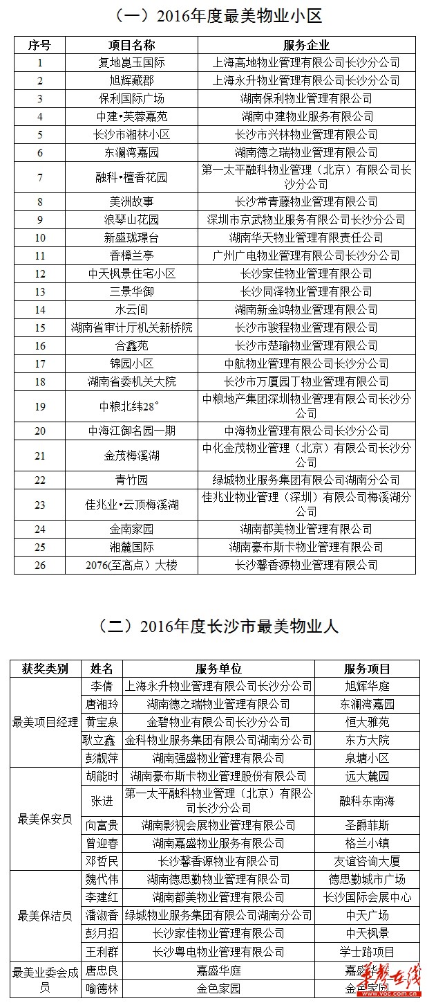2016年3月12日,三湘都市报和长沙市物业管理协会联合发布了《关于开展2016年度长沙市“最美物业人”行业评选活动工作的通知》的要求,全市物业管理行业积极响应、踊跃报名,直至截止报名,本次评选活动申报长沙市最美物业小区的有40个物业小区,申报最美物业人的有89名基层员工,申报最美业委会成员的有7名业委会委员。根据评选工作流程,经社会公众投票和专家评审,符合“最美物业人”考评标准的有:26个最美物业小区、15名最美物业人和2名最美业委会成员,为充分发扬民主,广泛接受监督,三湘都市报和长沙市物业管理协会现将拟表彰名单予以公示,公示时间为2017年1月9日至1月15日。在此期间,市物业管理协会接受广大业主及社会公众对公示结果提出的异议,并对所反映的问题进行调查与核实,联系电话0731-84486110。