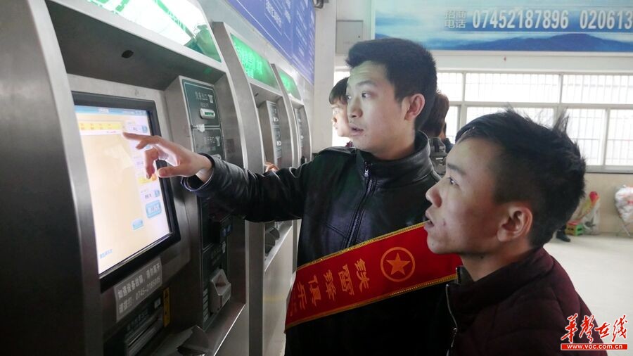 蔡亚男正在自助售票机前帮助旅客购买回程车票。