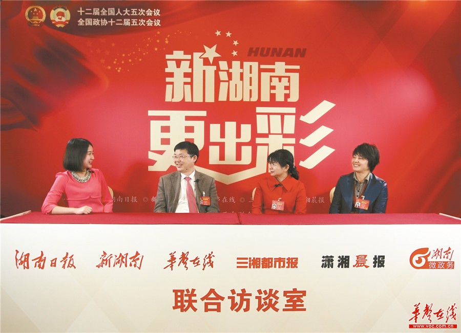 3月6日,刘长庚委员(左二)、杨莉代表(右二)、张青娥代表(右一)接受联合访谈。湖南日报记者 赵持 摄
