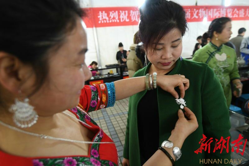 在湖南省文物商店,记者看到,除了从全国各地赶来的文物参展商,还有来自张家界向王银号的工匠展示传统银饰制作和来自怀化的金蝉玉手工刺绣的旗袍的展示,市民在体验淘宝捡漏乐趣的同时,也见识了文玩收藏与非遗、传统工艺碰出的火花。