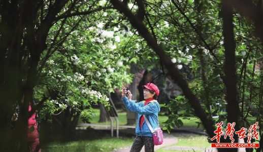 4月7日,长沙市开福区紫凤公园,游客在盛开的琼花树前拍照。目前,园内琼花已陆续盛开,花期约20天,市民可免费到紫凤公园观花赏景。记者 田超 摄