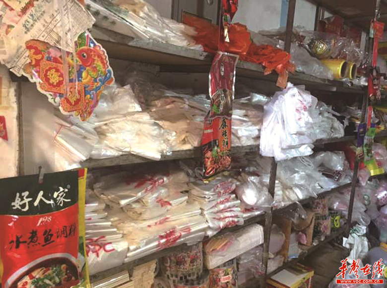 15日上午,记者来到竹山园粮油干货批发市场,发现“限塑令”禁用的超薄塑料袋在这里随处可见。记者随意进入了一家老蒋干货调料餐饮用品商行,在问到有没有卖塑料袋时,老板朝墙上一指,“各种型号都有,60个装,大的4块钱,小2块钱。”记者发现,一面墙有三分之二摆的都是塑料袋,而且都是超薄塑料袋。