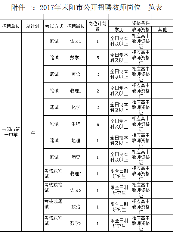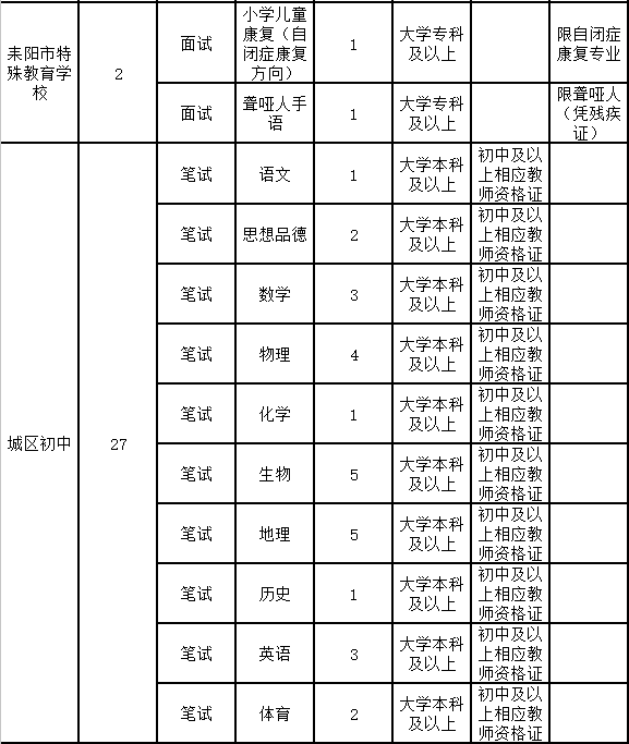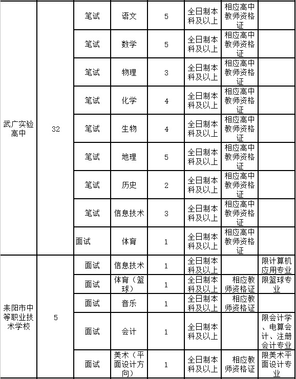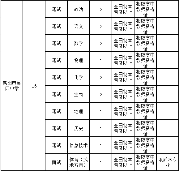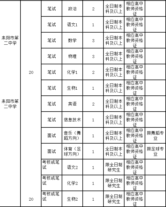 3.年龄在35周岁以下(1982年1月1日以后出生),其中报考耒阳一中、二中、四中、武广实验高中、中等职业技术学校招聘岗位且有5年及以上耒阳市高中(中等职业技术)学校任教经历的以及报考特殊教育招聘岗位的,年龄放宽到40周岁(1977年1月1日以后出生);