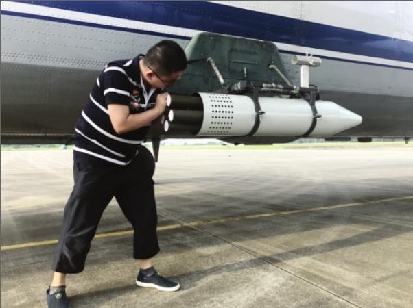 机组工作人员正在为增雨飞机安装焰弹、焰条设备。 组图/记者储文静