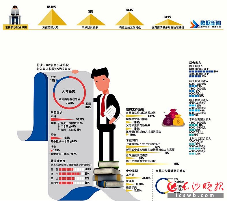 为进一步了解最近两年内入职的高校毕业生及海归学子的就业现状,有效提升长沙市人才吸引力,长沙市统计局选取长沙市103家企事业单位,对近2000名员工进行了“新入职人员就业现状”调查,近日公布调查情况。