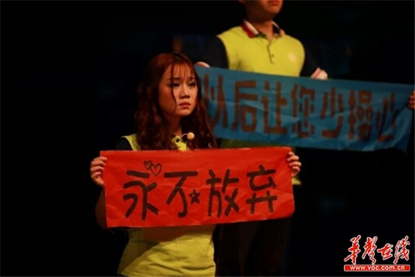 展演之后,是大型原创职校生素质教育音乐剧《永不放弃》。该剧以长沙财经学校中等职业教育为故事原型,以该校组织、动员、选拔、训练学生积极参加“职业技能大赛”过程为中心事件,用舞台音乐剧的形式,从一所职业高中校园生活的一个截面,真实、生动而艺术地反映一群职高学生,在学校、老师的帮助教育下,化茧成蝶的过程,展示湖南职业教育的丰硕成果和职高学生的文明风采。该剧由省教育厅职业教育与成人教育处、长沙市教育局指导,总顾问之一是李谷一,长沙财经学校师生演出,总时长60分钟。演出获得了圆满成功,精彩之处让人深受感动,泪眼朦胧。来自株洲市幼儿师范学校的学生李小美说,看了演出后,更坚定了选择中职同样可走出精彩人生的信心。