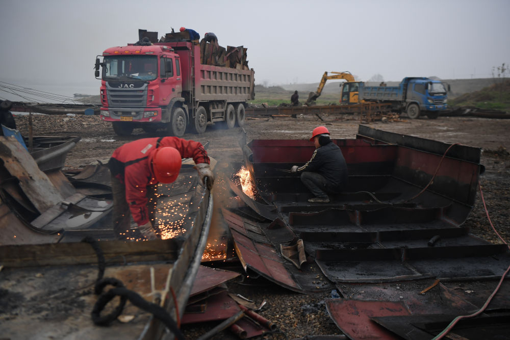 在湖南益阳资阳区,工作人员在资江边拆解渔民上交的渔船(2019年12月24日摄)。 新华社记者 薛宇舸摄