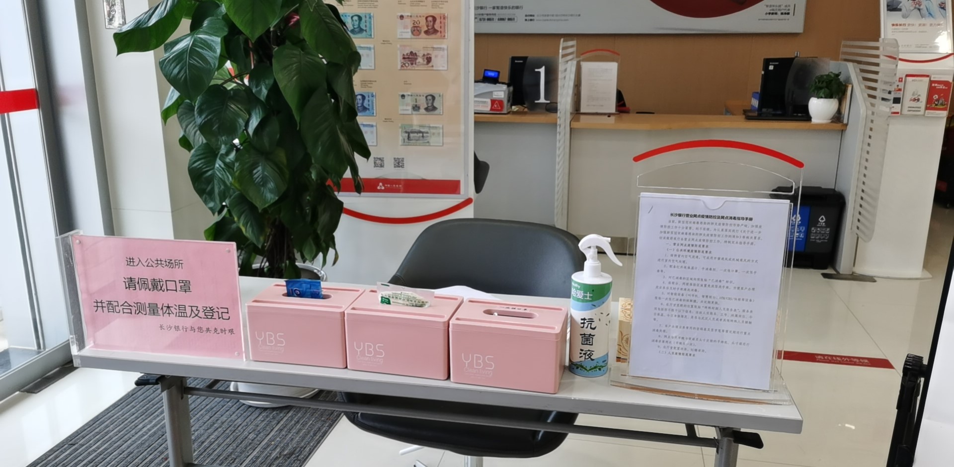 走进长沙银行望城支行营业网点,门口处摆放着医用口罩、一次性手套、消毒水、免洗洗手液、抗病毒中药供客户使用,网点工作人员手持体温枪对每一位客户进行体温测量并进行登记,大厅内的电子显示屏时刻向社会公众传递着疫情防控的相关知识,“今日已消毒”的温馨提示更是让前来办理业务的客户感到放心、舒心。