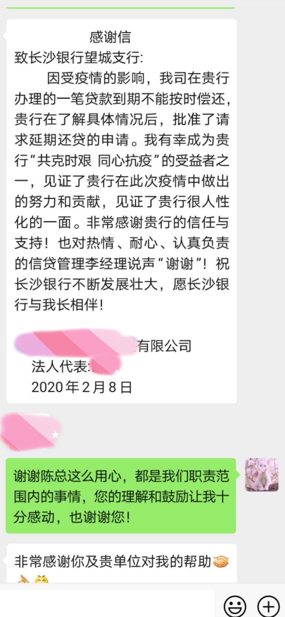 1月28日,东辉公司负责人陈强抱着试一试的心态联系长沙银行咨询延迟还贷事宜。在了解到客户的实际困难后,长沙银行从总行到支行迅速行动,在启动绿色处置通道、帮助东辉公司发起延迟还款申请后,最终将该笔贷款到期延后一个月。从启动“绿色通道”到最终完成审批,用时仅一个多小时,用速度和温度为客户解决了资金难题。