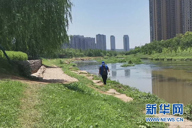长沙市雨花区圭塘河边,刘常彪正在巡河。