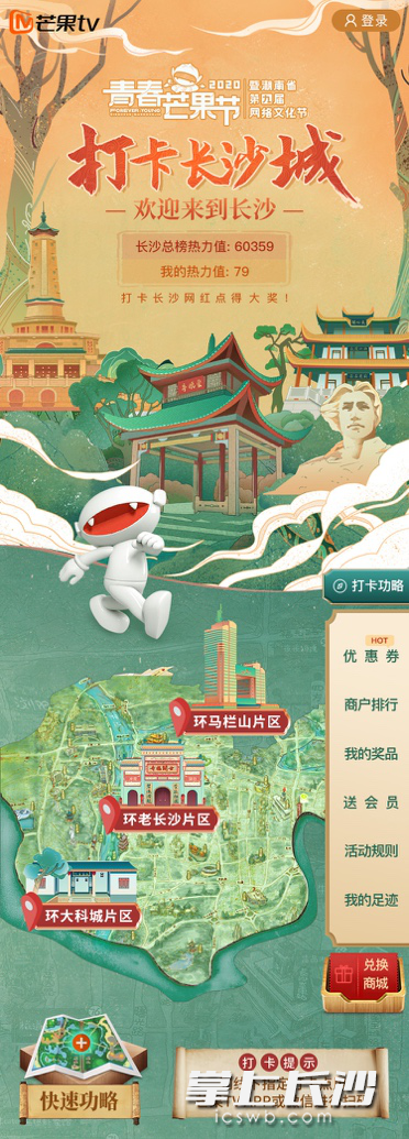 “青春芒果节 打卡长沙城”活动将以线上+线下联动打卡的方式展开。本次打卡活动提供“吃喝玩乐一条龙”服务,涵盖历史遗迹、演出展览等公共文化场馆。长沙市民和所有来访长沙的游客,可以通过扫码众多户外场所的青春芒果节宣传海报进入“长沙网红点热力地图”活动页面,免费获取芒果TV送出的会员时长及权益,通过定位打卡网红点累积“青春热力值”,从而赢取包括青春芒果节门票、芒果TV会员卡等福利大礼包,并可享受长沙银行联名卡、中国移动和包提供的消费优惠。