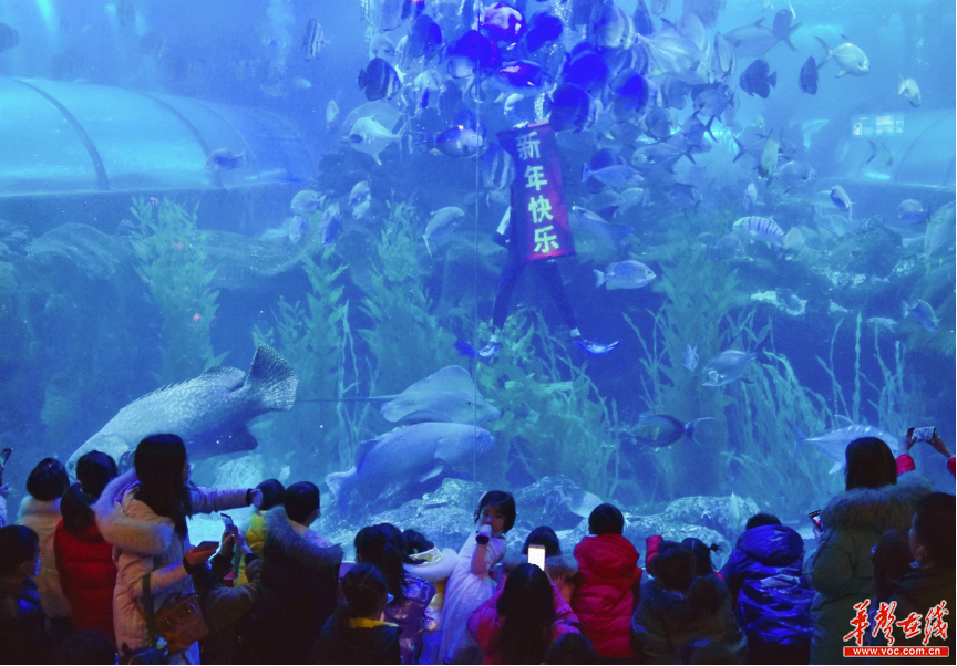 1月1日,长沙海底世界,潜水员与群鱼共舞,跟游客互动,向大家送上最诚挚的节日祝福。