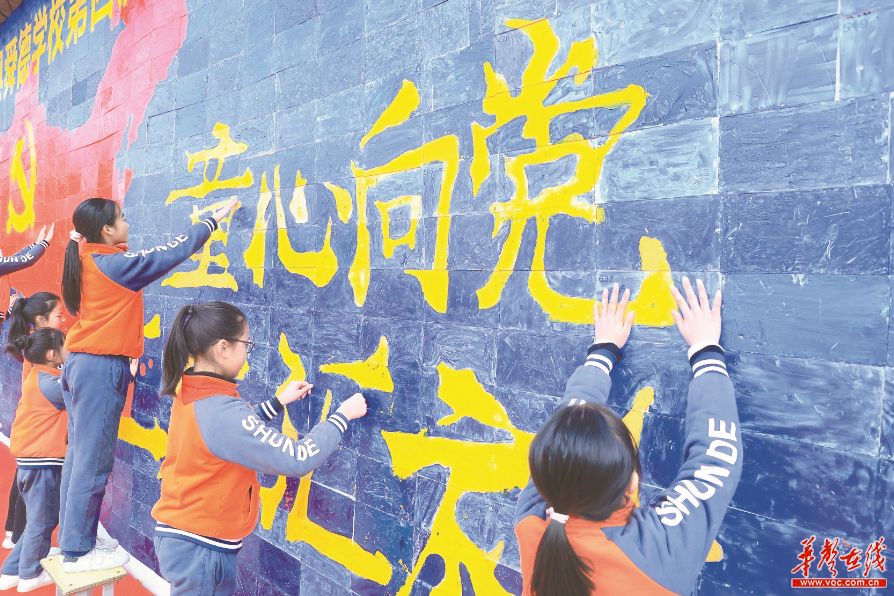2020年12月31日,东安县舜德学校学生通过千块拼图拼出童心向党展板,喜迎元旦,献礼建党100周年。严洁 摄