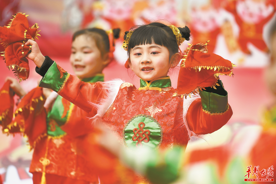 2020年12月31日,张家界市张家界第一幼儿园,孩子们在表演手绢花舞。当天,该园举行“体验民俗乐 欢度中国年”迎新贺岁活动,喜迎新年。邵颖 摄