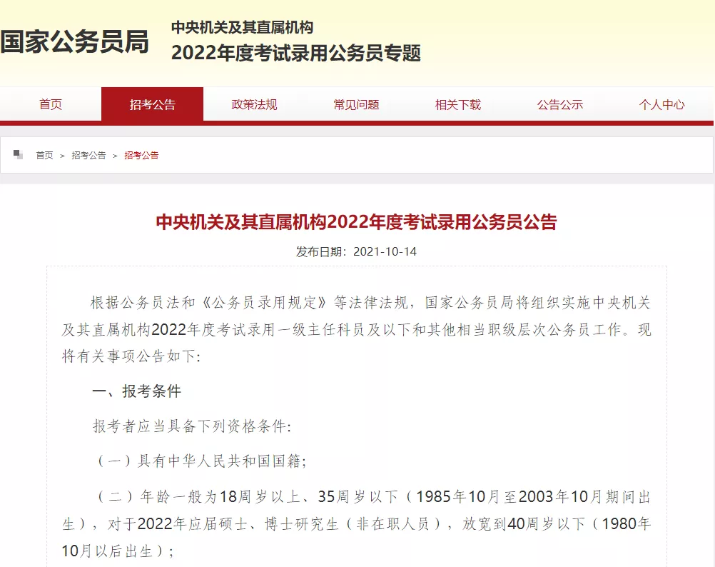 考生可于10月15日8:00至10月24日18:00期间,登录“中央机关及其直属机构2022年度考试录用公务员专题网站”(http://bm.scs.gov.cn/kl2022)进行网上报名。公共科目笔试将于11月28日在全国各直辖市、省会城市、自治区首府和个别较大的城市同时举行。