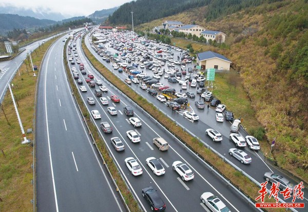 (2月6日中午,武深高速炎陵服务区和相邻的中村互通由北往南方向,车辆行驶缓慢,排起了长队,与空空如也的对向车道形成鲜明对比。湖南日报全媒体记者 童迪 摄)