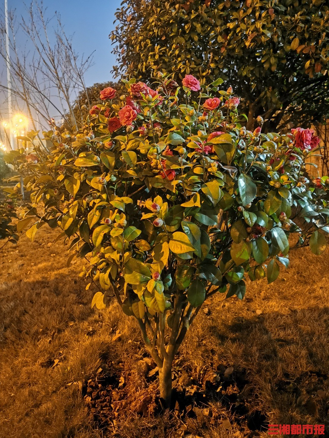 (3月11日晚上,长沙市开福大道与冯蔡路口交汇处的绿化带里,五六棵茶花树开满了粉红色的花朵。)