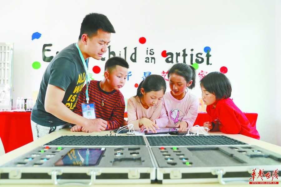 4月24日,新田县枧头镇彭梓城村小学,学生在老师指导下学习机器人编程。当天,该校开展无人机、机器人编程,人工智能等科技体验教学活动,激发学生从小爱科学、学科学、用科学的兴趣和热情。刘贵雄 刘庆 摄影报道