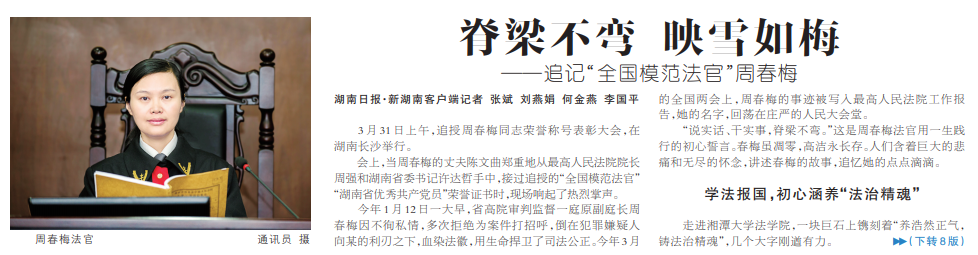 (2021年4月1日,湖南日报头版《脊梁不弯 映雪如梅》)