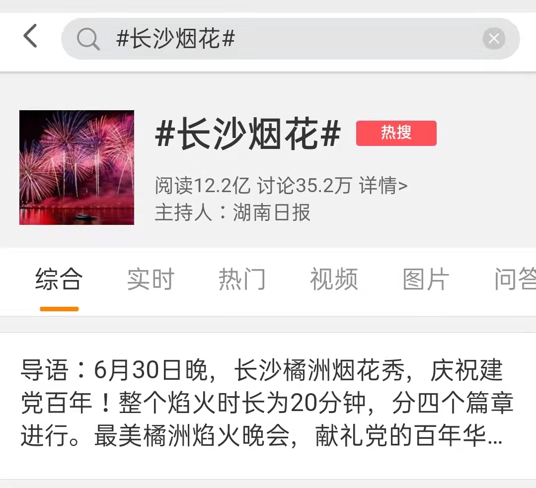 (2021年6月30日,湖南日报微博主持的话题#长沙烟花#阅读量超12亿)