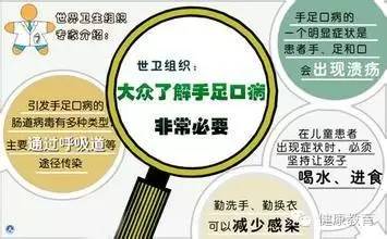 手足口病:手足口病是由肠道病毒引起的传染病,多发生于5岁以下儿童,表现为口痛、厌食、低热及手、足、口腔等部位出现小疱疹或小溃疡。多数患儿一周左右自愈,少数患儿可引起心肌炎、肺水肿、无菌性脑膜脑炎等并发症。个别重症患儿病情发展快,导致死亡。目前缺乏有效治疗药物,主要对症治疗。