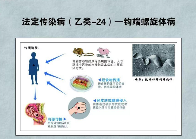 钩端螺旋体病:简称钩体病,是遭遇洪灾后需要重点防范的传染病之一。发病者以青壮年、有接触疫水者为主。猪是洪水型钩体病流行的主要传染源,家畜和鼠类、蛙类等是次要传染源。钩端螺旋体具有很强的侵袭力,通过皮肤、眼结膜、鼻或口腔粘膜侵入人体,临床上常见的是发高烧、头痛、全身酸痛、腓肠肌(小腿)疼痛、眼结膜充血、淋巴结肿大等。