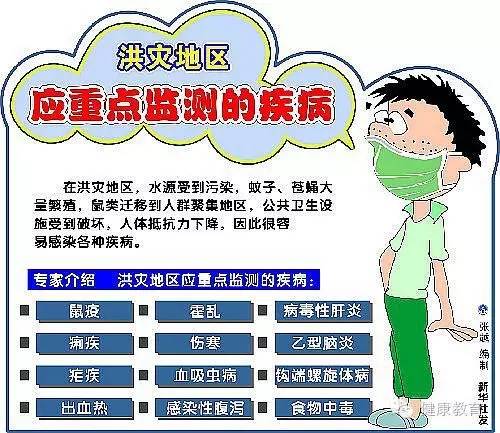 首先要预防的是肠道传染病,如霍乱、伤寒/副伤寒、痢疾、甲型肝炎(戊型肝炎)、手足口病等。人畜共患疾病和自然疫源性疾病也是洪涝期间极易发生的,如鼠媒传染病钩端螺旋体病、流行性出血热以及蚊媒传染病登革热等;水灾过后还可能患皮肤病如浸渍性皮炎、虫咬性皮炎、尾蚴性皮炎。另外还要注意防治食物中毒、农药中毒等。