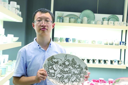 (泰鑫瓷业有限公司技术总监卢日高展示“会讲故事”的瓷器。)