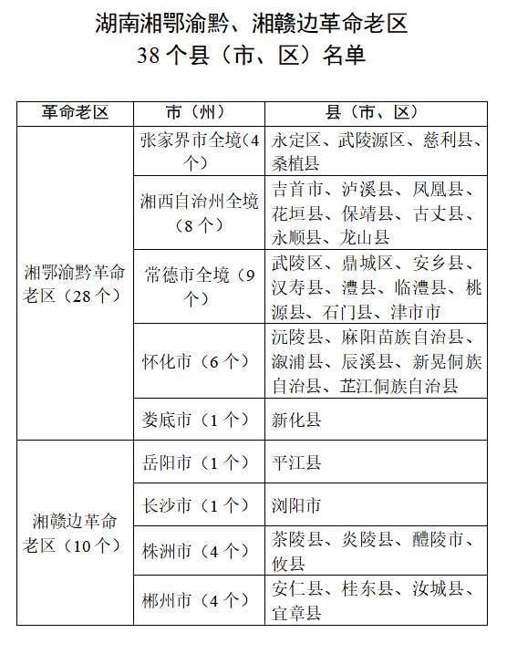 湘鄂渝黔革命老区包括张家界市全境4个县(市、区)、湘西土家族苗族自治州全境8个县(市、区)、常德市全境9个县(市、区)、怀化市6个县(市、区)、娄底市新化县。湘赣边革命老区包括岳阳市平江县、长沙市浏阳市、郴州市4个县(市、区)、株洲市4个县(市、区)。