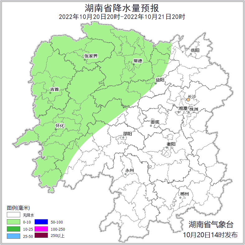 20日20时至21日20时,湘西州、怀化、张家界、常德、益阳、娄底西部、邵阳西部多云间阴天有分散性小雨,其他地区晴天到多云;北风2~3级;最高气温湘西21~23℃,其他地区26~28℃;最低气温湘西12~14℃,其他地区16~18℃。